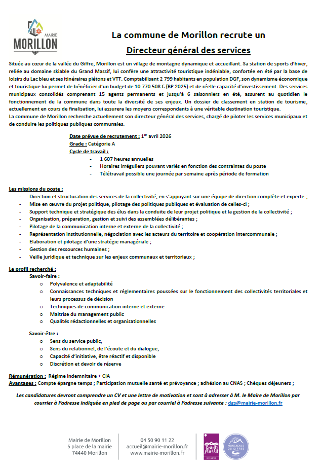 Morillon recrute un Directeur/trice Général(e) des Services 19 février 2026 dans Actualité, Recrutement 📄Toutes les informations utiles sont à retrouver sous le lien suivant : Recrutement